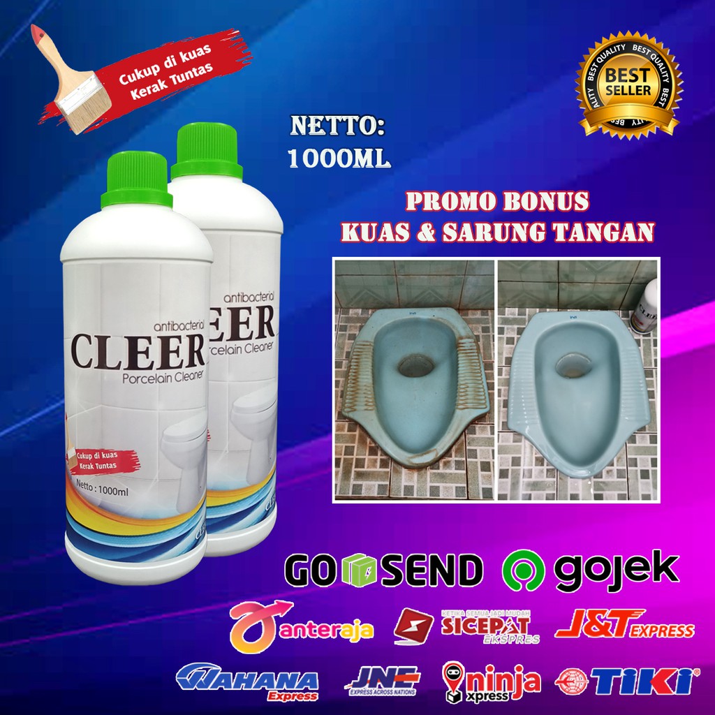 CLEER PORCELAIN CLEANERMerupakan cairan pembersih keramik & porselen ekstra kuat yang terbuat dari bahan-bahan aktif yang berstandar internasional dan terbukti sangat efektif untuk mengupas dan membersihkan kerak air yang telah menempel dan mengedap pada keramik dan porselen selama ber tahun-tahun dengan sangat cepat dan mudah.Keunggulan CLEER Porcelain Cleaner-Tidak menggunakan HCL-Tidak merusak keramik dan nat(sambungan keramik)-Tidak merusak warna warna keramik/porselen-Bisa di gunakan untuk keramik putih,ber warna maupun ber texture-Tidak perlu di sikat,hanya perlu di kuas-tidak perlu menunggu(tuang.langsung kuas)-Lebih efektif dan efesien.sangat menghemat tenaga dan waktu anda-Dapat di gunakan untuk semua jenis & warna keramik-COCOK untuk porselen,keramik,stainless & plastik-Tidak cocok untuk granit,ubin,marmer &teraso-Perhatikan dan ikuti petunjuk pemakaian!Cara pemakaian CLEER Porcelain Cleaner1.Kocok botol sebelum di gunakan2.Tuangkan cairan pembersih ke wadah3.Celupkan kuas ke wadah cairan pembersih4.Oleskan kuas ke permukaan yang ingin di bersihkan5.Tunggu 1-2 menit biar cairan meresap ke dalam kerak/noda keramik6.Lalu kuas berulang kerak/noda yang membandel 7.setelah bersih siram menggunakan airTAKARAN YANG DI SARANKAN*Kerak Ringan 1:3*Kerak Sedang 1:2*Kerak Berat 1:1 atau tanpa di campur air untuk perawatan,gunakan cairan CLEER yang di campur air dengan perbandingan 1:5PRODUK SELALU READY!!!Silahkan langsung di order saja...~Order jam 00-00-16.00 di kirim langsung~Order jam 17.00-23.00 di kirim b