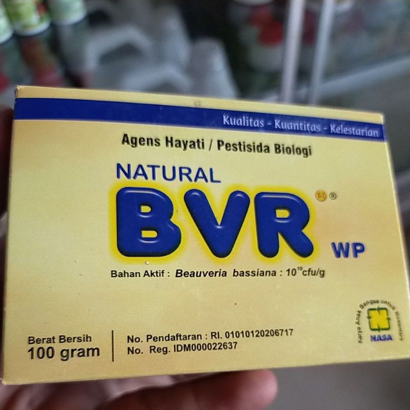 Natural BVR (Beuveria Bassiana) merupakan salah satu produk pestisida organik PT Natural Nusantara sebagai pengendali hama dan penyakit pada tanaman. Natural BVR sangat efektif dan efisien membasmi hama sasaran, akan tetapi tidak akan mematikan musuh alami, jadi, sangat selaras dengan keseimbangan alam. Natural BVR mendukung program pertanian berkelanjutan, mudah digunakan dan harganya cukup terjangkau, aman bagi lingkungan, manusia dan juga hewan.Manfaat Penggunaan Natural BVR BVR Efektif dan efisien terhadap hama sasaran BVR Tidak mematikan musuh alami BVR Selaras keseimbangan alam, mudah dan relatif murah BVR Mendukung program pertanian berkelanjutanBVR Aman terhadap lingkungan, manusia dan hewan Mekanisme Kerja Natural BVR Natural BVR masuk melalui mulut serangga hama, kemudian tumbuh dan berkembang menghancurkan sistem organ dari dalam. BVR menempel pada kulit hama dan mengeluarkan enzim (Kitinase, Protease, Lipase) untuk menghancurkan kulit. BVR mengeluarkan racun (Beauvericin, Beauveroilides, Asam oksalat) untuk membunuh hama. Miselium tumbuh secara progresif dan muncul badan buah berwarna putih pada hama yang mati, jika hama terinfeksi tersinggung hama sehat, maka hama akan tertulari, penularan dapat melalui angin. Kematian hama berkisar + 4-8 hari setelah terinfeksi BVR.Tanaman Sasaran Padi, Bawang merah, Kacang panjang, Cabai, Tomat, Kubis, Buncis, Semangka, Kentang, Apel, Mangga, Coklat Hama Sasaran Utama Wereng (Nilaparvata sp.; Nephotettix sp.; Sogatella sp.), Penggerek batang padi (Thryporhiza sp.; Chilo supressalis), Walang sangit (Leptocorixa accuta), Kutu Daun, Kutu Dompolan, Penggerek buah coklat Petunjuk Penggunaan BVR Dosis 1-2 gram/liter atau + 100 gram per 1000 m2 Semprotkan ke tanaman pada sore hari Bisa dicampurkan dengan POC NASA atau Hormonik Peringatan Penggunaan BVR! Jangan dicampur dengan pestisida