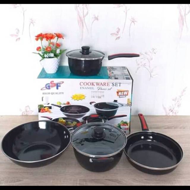 Panci Set Enamel GSF Cookware Set Tutup Kaca GSFDetai Produk :Satu Set peralatan masak serba guna.Kualitas bahan terbuat dari enamel yang dapat menghantar panas dengan cepat dan merata serta anti karat.Dilengkapi dengan tutup kaca yang anti panas memudahkan anda untuk melihat masakan dan tingkat kematangan pada masakan yang sedang anda masak.Memasak tanpa menggunakan banyak minyak dan mudah dibersihkan.Kelebihan produk :Dilapisi dengan lapisan anti lengket.Lapisan tidak mudah terkelupas dan berkaratBahan tebal, kuat dan tahan lama.Handle tidak panas, nyaman ditanganBisa untuk kompor induksiSet panci terdiri dari :1pc Panci Sauce pan diameter 18 cm , tinggi 9.5 cm + tutup kaca1pc Panci Dutch Oven / Panci Soup diameter 24 cm , tinggi 12 cm + tutup kaca1pc Wajan Fry Pan diameter 26 cm , tinggi 5 cm1pc Wajan Fry Pan diameter 30 cm , tinggi
