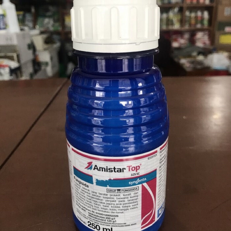Amistar Top 325SC merupakan fungisida sistemik yang dapat mengobati berbagai penyakit pada tanaman yang disebabkan oleh jamur. Amistar Top juga dilengkapi dengan ZPT (Zat Pengatur Tumbuh) yang berfungsi untuk pemulihan dan perlindungan pada tanaman serta mencegah agar tidak terserang jamur lagiBentuk dari fungisida Amistar top 325SC adalah pekatan suspensi berwarna kuning muda. AMISTAR TOP 325SC baik untuk mengendalikan penyakit dan meningkatkan kualitas dari hasil panen.Sangat efektif untuk mengobati tanaman yang terkena penyakit yang disebabkan oleh jamur seperti: bercak ungu, bercak daun, embun tepung, embun bulu, busuk buah, busuk daun, dstBerat bersih: 250 mlBahan aktif: azoksistrobin (azoxystrobin) 200 g/l, difenokonazol (difenoconazole) 125 g/lFungsida sistemik yang bersifat protektif, kuratif, dan preventif berbentuk pekatan susp