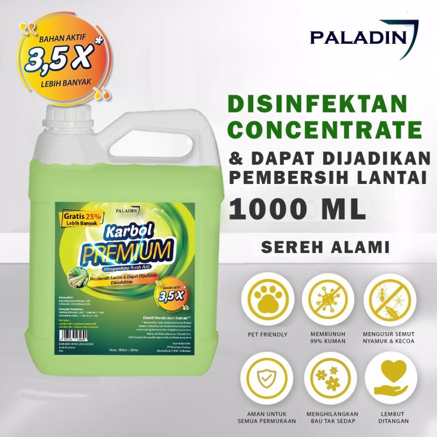 NEW FORMULA!!DISINFEKTAN KARBOL PREMIUM PALADIN 5000ML1 liter Paladin Karbol Premium dapat dijadikan 500 LITER DISINFEKTAN yang sudah dicampur airKeunggulan :✅ Bahan Aktif 3,5x lebih banyak dibandingkan merek lain✅ Efektif membunuh kuman, bakteri dan virus sampai dengan 99,9%✅ Mengandung minyak sereh asli✅ Dapat dijadikan Disinfektan✅ Dibuat dari Pabrik bukan Home Industry✅ Multiguna✅ Penghilang bau tidak sedap✅ Dapat mengusir serangga (nyamuk, lalat, kecoa, semut)Aturan Pakai :*️⃣ Campurkan 12ml ke 1 liter air untuk membersihkan lantai*️⃣ Campurkan 20ml ke 1 liter air untuk membuat cairan disinfektanBarang ready! Stock sudah disesuaikan.SUDAH TERBUKTI DAN TER