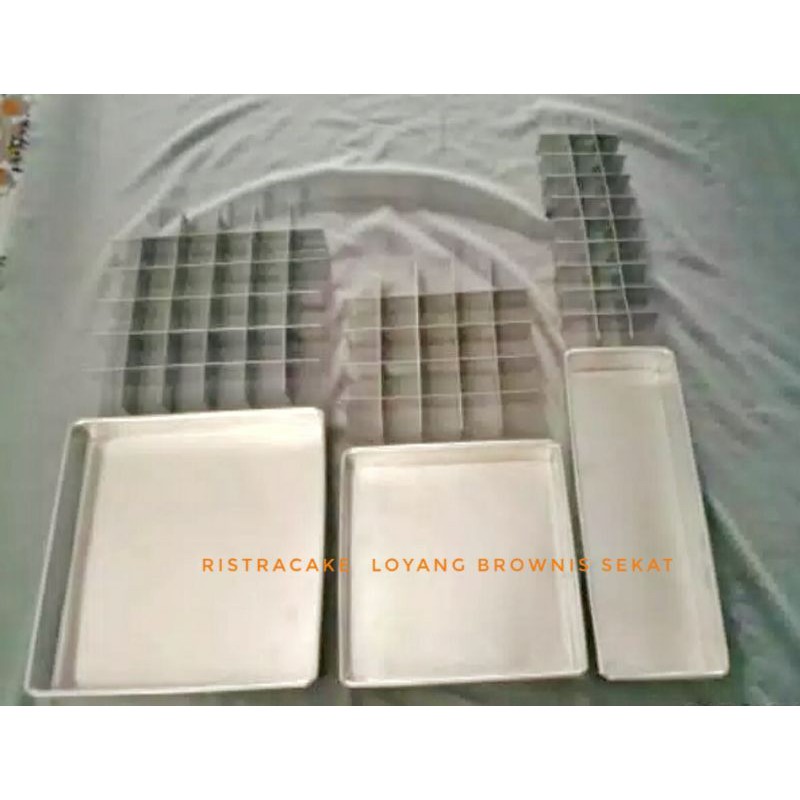 loyang sekat brownis murahterbuat dari bahan alumunium tebaltebal sekat 0,7 mmtebal loyang 0,4 mm kawat kelim tebalbisa pilih di variasi sekat saja atau + loyang nya.. ukuran 20x20x4 25 lubangukuran 24x24x4 36 lubangukuran 30x30x4 36 lubangklik di variasi sesuai dengan kebutuhan bundahappy sho