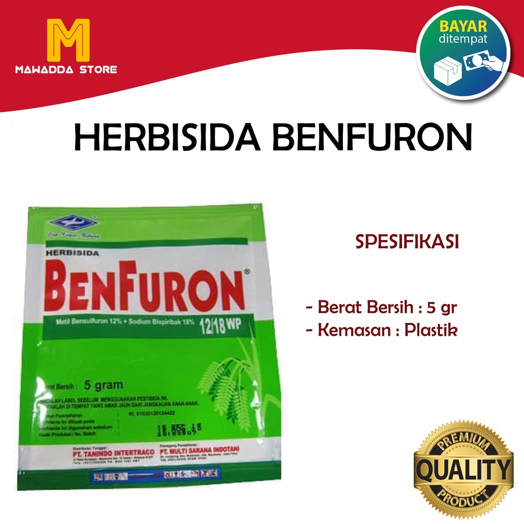 Deskripsi Obat Pertanian Pengendali Gulma BENFURON 5 gramAksi ganda BenfuronDari sekian banyak gulma yang umum dijumpai pada tanaman padi, ada golongan gulma yang disebut sebagai gulma jahat (noxious weeds). Gulma tersebut masuk kelompok tumbuhan C4 yang menyukai kondisi lingkungan panas, intensitas cahaya tinggi, dan lebih efisien dalam menggunakan air dan nitrogen dibanding tumbuhan C3 (padi). Contohnya adalah: teki (Fymbristilis miliacea), eceng gondok (Monochoria vaginalis), dan jajagoan (Echinochloa sp.).Disebut sebagai gulma jahat karena beberapa ciri, yaitu: tingkat persaingannya tinggi meskipun populasinya rendah, efisien dalam perbanyakan diri baik melalui biji yang jumlahnya melimpah maupun dengan perbanyakan vegetatif, dan mudah menyebar dan mempunyai masa dormansi yang lama sehingga sukar diberantas.Menurut Mudjahiddin, meskipun disebut gulma jahat pada tanaman padi, bukan berarti tidak bisa diberantas. Yang penting harus cepat diberantas dan tidak dibiarkan sampai muncul bunga terlebih dahulu, apalagi menghasilkan biji.Salah satu caranya, lanjut Mudjahiddin, adalah dengan menggunakan herbisida khusus yang memiliki efektifitas tinggi untuk memberantas gulma berdaun lebar dan teki sekaligus, seperti herbisida sistemik Benfuron 12/18WP yang berbahan aktif ganda, metil bensulfuron 12% dan sodium bispiribak 18%.Metil bensulfuron selama ini sangat efektif untuk mengendalikan gulma semanggi dan gulma berdaun lebar lainnya seperti eceng atau weweyan, genjer, dan cacabean. Selain itu juga cukup efektif untuk mengatasi gulma teki-te